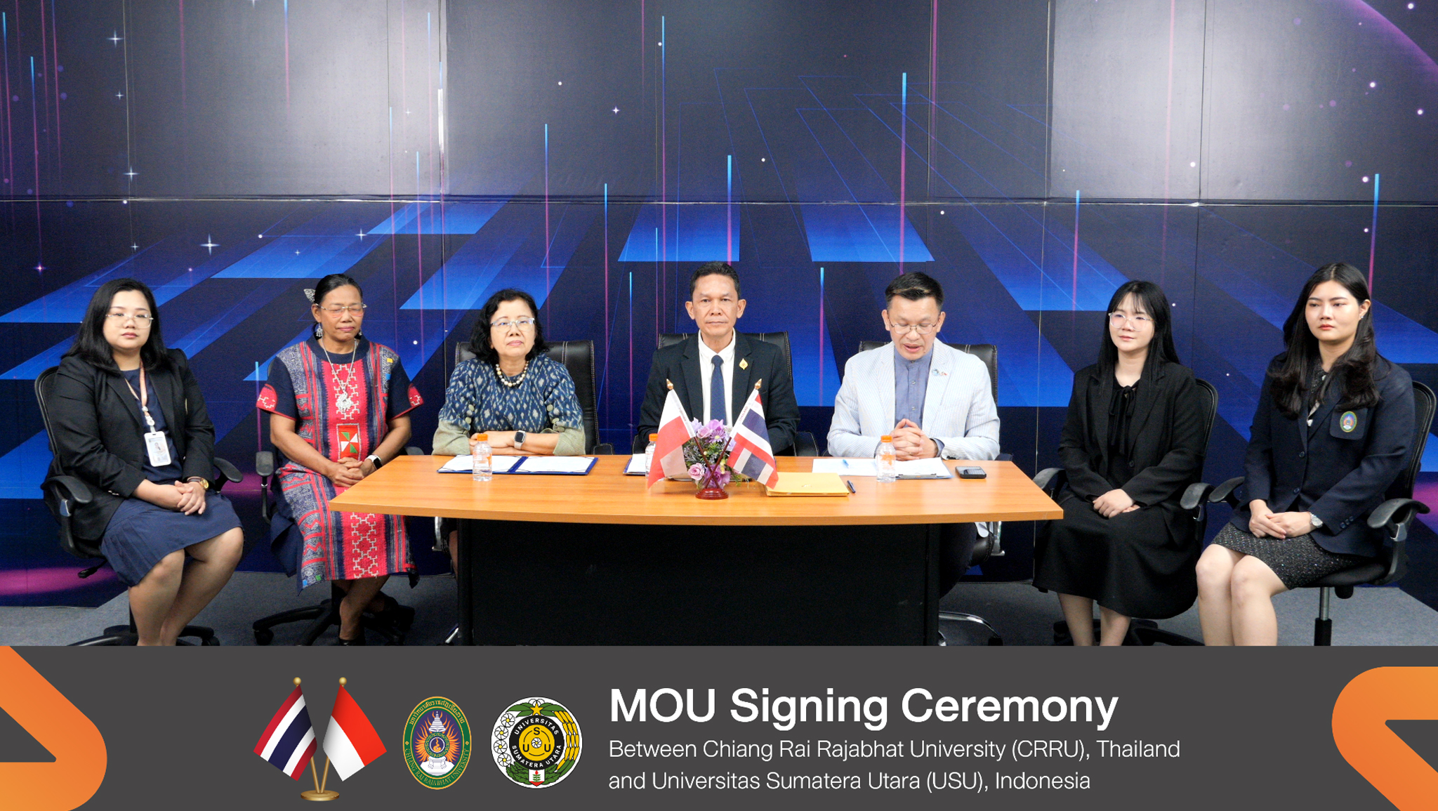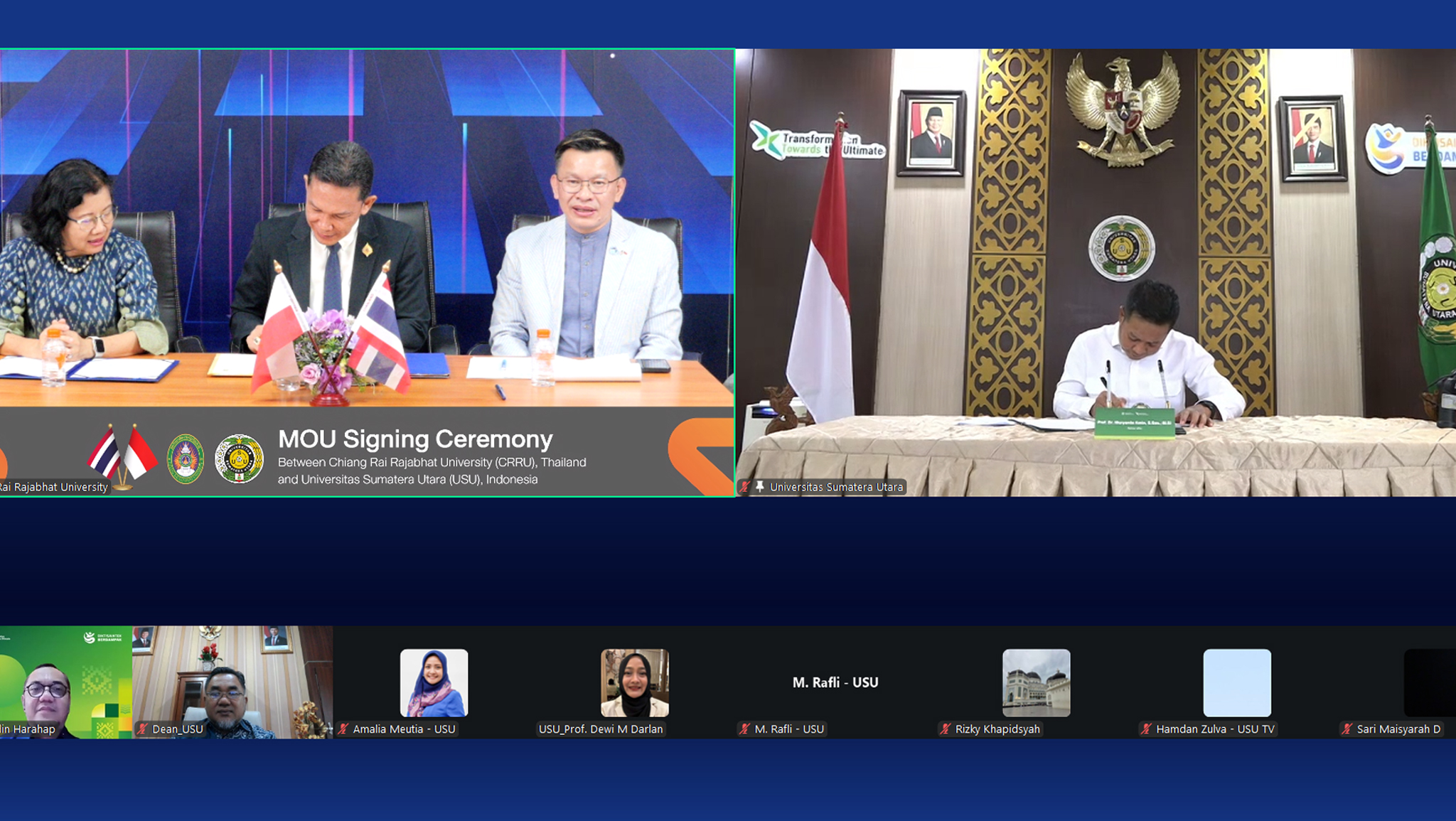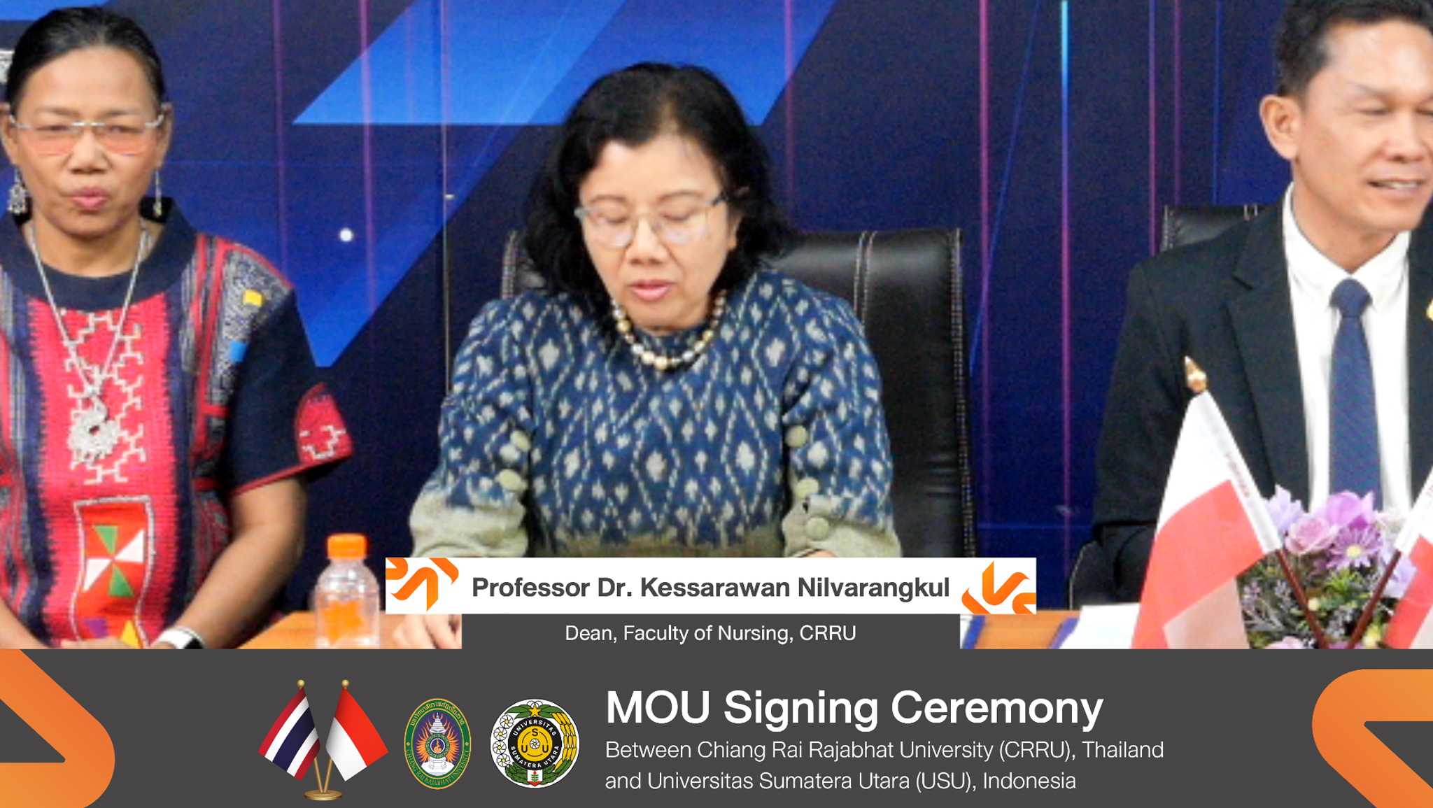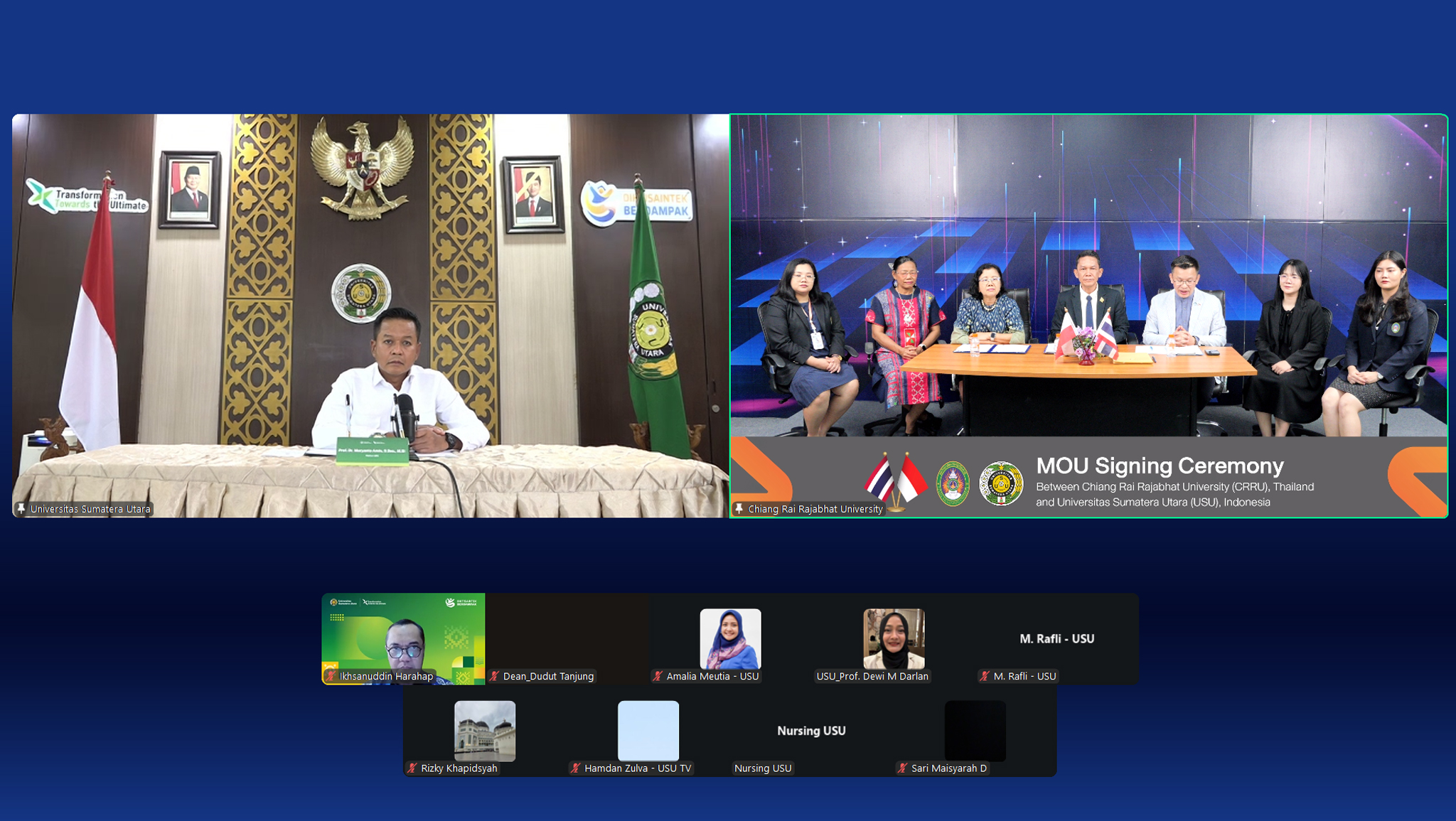วันที่ 21 เมษายน 2569 รองศาสตราจารย์ ดร.ไพโรจน์ ด้วงนคร อธิการบดีมหาวิทยาลัยราชภัฏเชียงราย เป็นประธานในพิธีลงนามบันทึกความเข้าใจ (Memorandum of Understanding : MOU) เพื่อสร้างความร่วมมือทางวิชาการระหว่างคณะพยาบาลศาสตร์ มหาวิทยาลัยราชภัฏเชียงราย กับ Universitas Sumatera Utara (USU) สาธารณรัฐอินโดนีเซีย ณ ห้องสตูดิโอ มหาวิทยาลัยราชภัฏเชียงราย โดยจัดขึ้นในรูปแบบออนไลน์ผ่านระบบ Zoom Video Conferencing