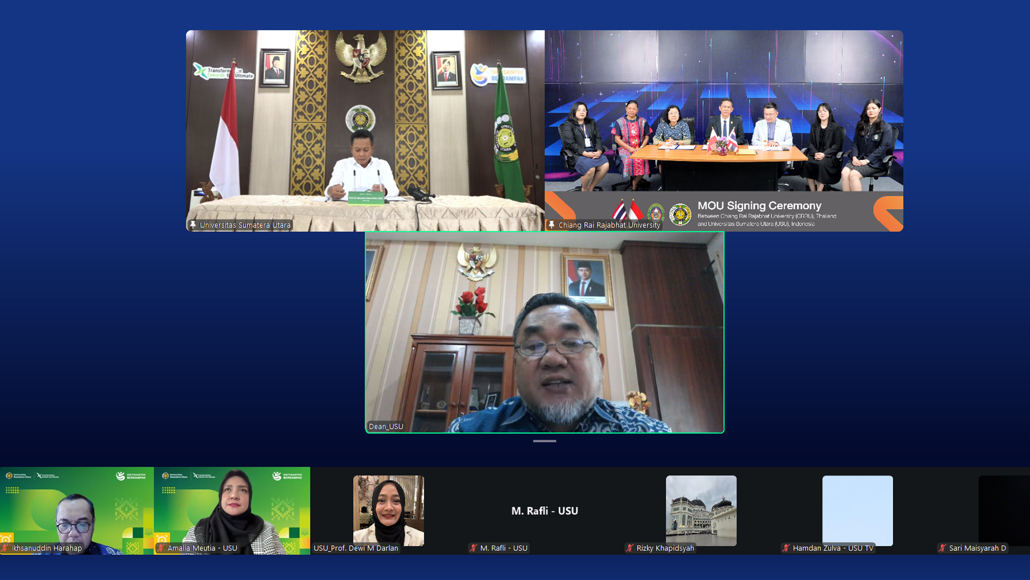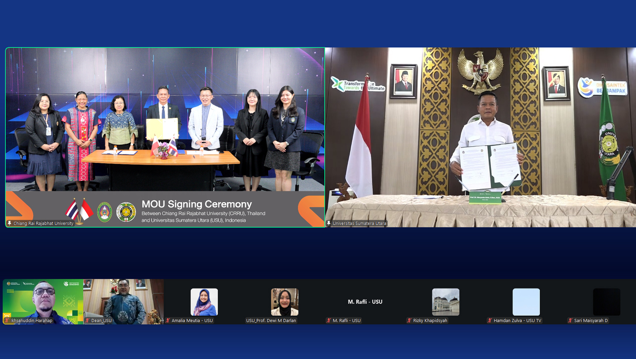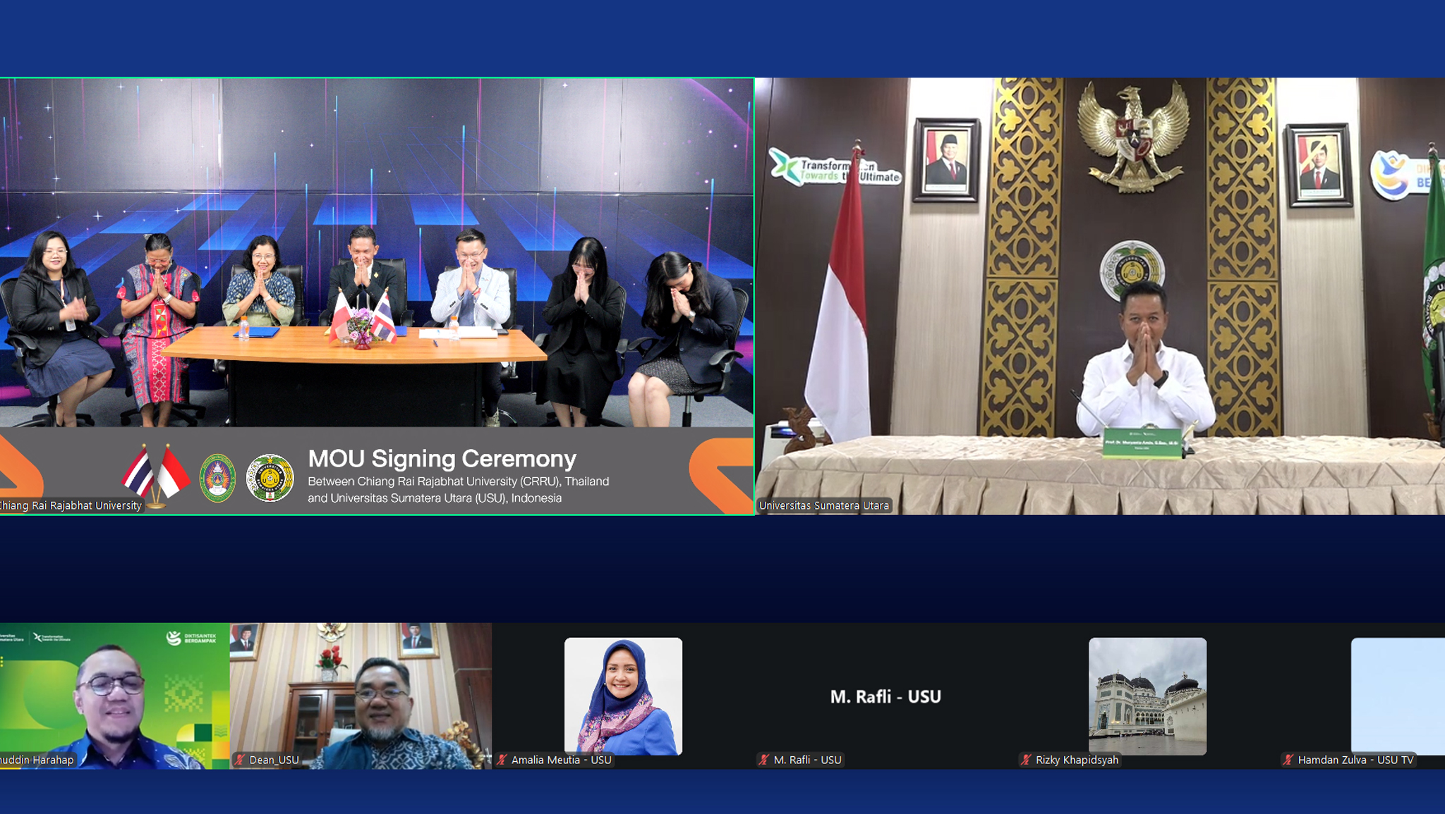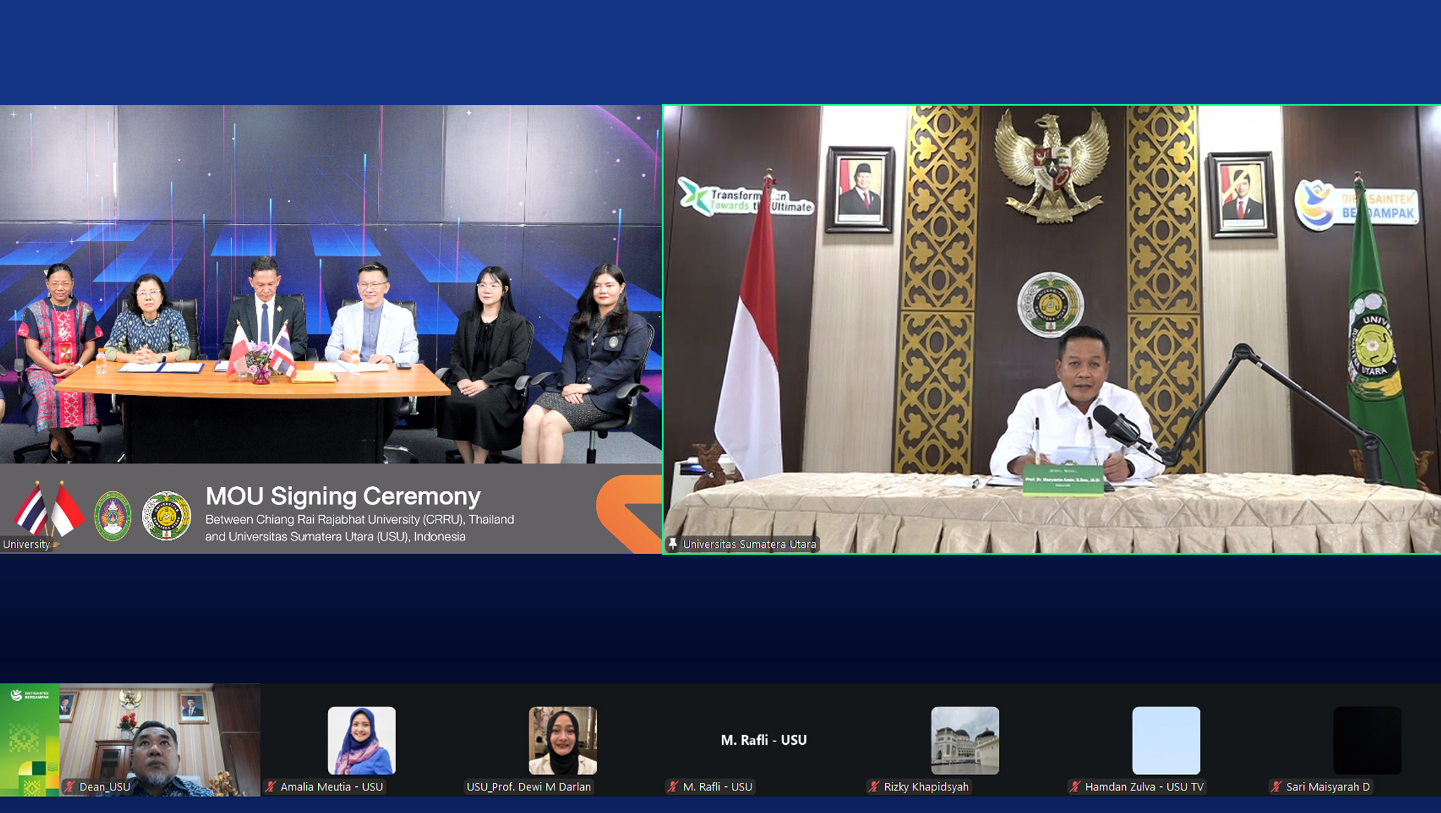 วันที่ 21 เมษายน 2569 รองศาสตราจารย์ ดร.ไพโรจน์ ด้วงนคร อธิการบดีมหาวิทยาลัยราชภัฏเชียงราย เป็นประธานในพิธีลงนามบันทึกความเข้าใจ (Memorandum of Understanding : MOU) เพื่อสร้างความร่วมมือทางวิชาการระหว่างคณะพยาบาลศาสตร์ มหาวิทยาลัยราชภัฏเชียงราย กับ Universitas Sumatera Utara (USU) สาธารณรัฐอินโดนีเซีย ณ ห้องสตูดิโอ มหาวิทยาลัยราชภัฏเชียงราย โดยจัดขึ้นในรูปแบบออนไลน์ผ่านระบบ Zoom Video Conferencing